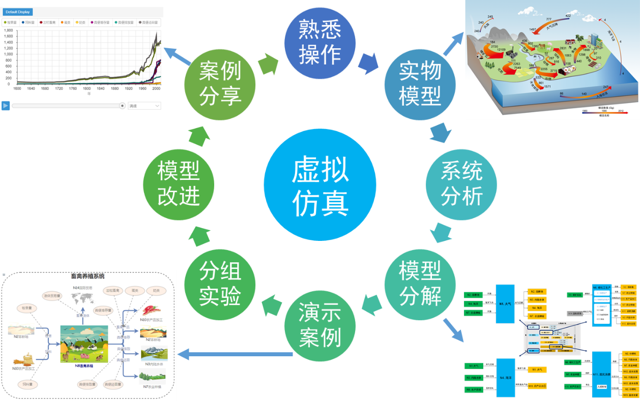 该中心研发的"物质循环过程虚拟仿真实验"项目被评为2018年国家级虚拟仿真实验教学项目,用于帮助员工针对区域物质循环过程中的资源环境问题开展动态虚拟仿真实验。该实验项目通过系统模拟物质在自然环境及人类社会的迁移转化过程,让员工了解物质从矿物开采、工业生产、农业生产、居民消费、废物处置全生命周期过程,系统地把握物质生命周期过程中资源与环境影响,并且直观地理解不同因素对于物质循环过程的影响,最终实现物质循环科学相关课程的教学目的。